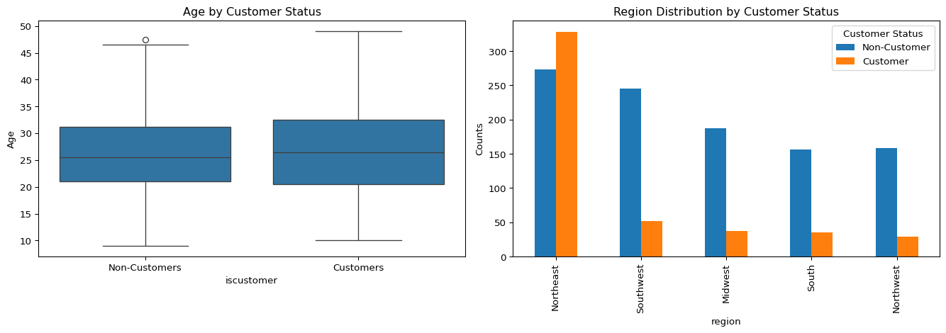 Customers tend to be slightly older than non-customers, with a mean age of 26.9 compared to 26.1. The age distributions are similar overall, but customer firms show a slightly higher median and greater variability. Regionally, the Northeast stands out with the highest number of customer firms (328), while other regions such as the Southwest, Midwest, South, and Northwest have significantly fewer customers. This suggests that both firm age and geographic location may be associated with customer status, with the Northeast possibly representing a key market area.