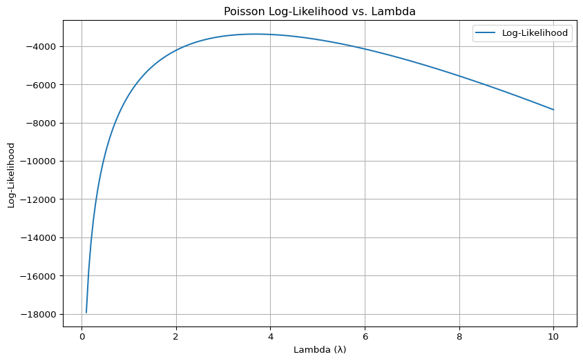 The function poisson_loglikelihood(lambda_, Y) calculates the log-likelihood of observing a dataset of counts (Y) under a Poisson distribution with rate parameter \(\lambda\). It assumes that the counts are independent and identically distributed. The function first checks whether \(\lambda\) is positive, since the Poisson rate must be greater than zero, and returns negative infinity if it is not. It then computes the log-likelihood by summing the terms (Y (\(\lambda\)) - \(\lambda\) - (Y!)) across all observations. The gammaln(Y + 1) function is used to compute ((Y!)) in a numerically stable way. This implementation is useful for estimating \(\lambda\) using maximum likelihood estimation.