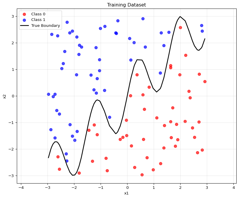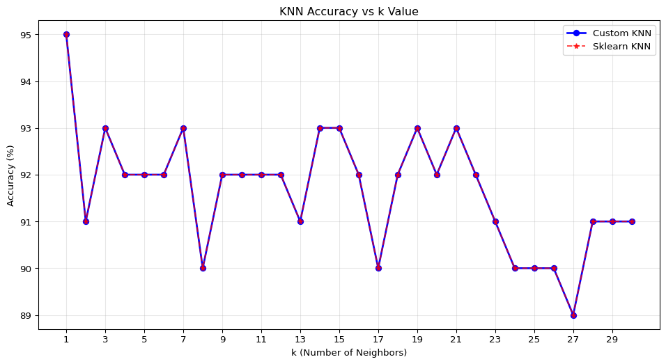 import numpy as npimport matplotlib.pyplot as pltfrom sklearn.neighbors import KNeighborsClassifierfrom sklearn.metrics import accuracy_scoreimport pandas as pdnp.random.seed(42)def generate_dataset(n=100, seed=42):"""Generate synthetic dataset with wiggly boundary""" np.random.seed(seed)# Generate random points x1 = np.random.uniform(-3, 3, n) x2 = np.random.uniform(-3, 3, n)# Define wiggly boundary boundary = np.sin(4* x1) + x1# Binary classification based on boundary y = (x2 > boundary).astype(int)return x1, x2, y, boundarydef plot_dataset(x1, x2, y, boundary=None, title="Dataset"):"""Plot the dataset with optional boundary""" plt.figure(figsize=(10, 8))# Plot points colored by class colors = ['red', 'blue'] labels = ['Class 0', 'Class 1']for i in [0, 1]: mask = y == i plt.scatter(x1[mask], x2[mask], c=colors[i], label=labels[i], alpha=0.7, s=50)if boundary isnotNone:# Sort by x1 for smooth boundary line sorted_idx = np.argsort(x1) plt.plot(x1[sorted_idx], boundary[sorted_idx], 'black', linewidth=2, label='True Boundary') plt.xlabel('x1') plt.ylabel('x2') plt.title(title) plt.legend() plt.grid(True, alpha=0.3) plt.axis('equal') plt.show()def euclidean_distance(point1, point2):"""Calculate Euclidean distance between two points"""return np.sqrt(np.sum((point1 - point2) **2))def knn_predict(X_train, y_train, X_test, k):""" Hand-implemented KNN classifier Parameters: X_train: Training features (n_samples, n_features) y_train: Training labels (n_samples,) X_test: Test features (m_samples, n_features) k: Number of neighbors Returns: predictions: Predicted labels for test set """ predictions = []for test_point in X_test:# Calculate distances to all training points distances = []for i, train_point inenumerate(X_train): dist = euclidean_distance(test_point, train_point) distances.append((dist, y_train[i]))# Sort by distance and get k nearest neighbors distances.sort(key=lambda x: x[0]) k_nearest = distances[:k]# Get labels of k nearest neighbors neighbor_labels = [label for _, label in k_nearest]# Predict based on majority vote prediction =max(set(neighbor_labels), key=neighbor_labels.count) predictions.append(prediction)return np.array(predictions)# Generate training datasetprint("Generating training dataset...")x1_train, x2_train, y_train, boundary_train = generate_dataset(n=100, seed=42)X_train = np.column_stack((x1_train, x2_train))# Plot training datasetplot_dataset(x1_train, x2_train, y_train, boundary_train, "Training Dataset")# Generate test dataset with different seedprint("Generating test dataset...")x1_test, x2_test, y_test, boundary_test = generate_dataset(n=100, seed=123)X_test = np.column_stack((x1_test, x2_test))# Test KNN implementation for different k valuesk_values =range(1, 31)accuracies_custom = []accuracies_sklearn = []print("Testing KNN for k = 1 to 30...")for k in k_values:# Custom KNN implementation y_pred_custom = knn_predict(X_train, y_train, X_test, k) accuracy_custom = accuracy_score(y_test, y_pred_custom) accuracies_custom.append(accuracy_custom)# Sklearn KNN for comparison knn_sklearn = KNeighborsClassifier(n_neighbors=k) knn_sklearn.fit(X_train, y_train) y_pred_sklearn = knn_sklearn.predict(X_test) accuracy_sklearn = accuracy_score(y_test, y_pred_sklearn) accuracies_sklearn.append(accuracy_sklearn)print(f"k={k:2d}: Custom KNN = {accuracy_custom:.3f}, Sklearn KNN = {accuracy_sklearn:.3f}")# Verify implementations matchprint(f"\nImplementations match: {np.allclose(accuracies_custom, accuracies_sklearn)}")# Plot accuracy vs kplt.figure(figsize=(12, 6))plt.plot(k_values, [acc *100for acc in accuracies_custom], 'bo-', label='Custom KNN', linewidth=2)plt.plot(k_values, [acc *100for acc in accuracies_sklearn], 'r*--', label='Sklearn KNN', alpha=0.7)plt.xlabel('k (Number of Neighbors)')plt.ylabel('Accuracy (%)')plt.title('KNN Accuracy vs k Value')plt.legend()plt.grid(True, alpha=0.3)plt.xticks(range(1, 31, 2))plt.show()# Find optimal koptimal_k = k_values[np.argmax(accuracies_custom)]max_accuracy =max(accuracies_custom)print(f"\nOptimal k value: {optimal_k}")print(f"Maximum accuracy: {max_accuracy:.3f} ({max_accuracy*100:.1f}%)")# Create summary tableresults_df = pd.DataFrame({'k': k_values,'Custom_KNN_Accuracy': [f"{acc:.3f}"for acc in accuracies_custom],'Sklearn_KNN_Accuracy': [f"{acc:.3f}"for acc in accuracies_sklearn]})print(f"\nSummary of first 10 k values:")print(results_df.head(10).to_string(index=False))
